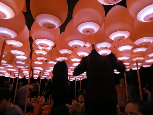 Showroom was a gallery installation produced by 18 architecture thesis students. The installation served to present each of our books, comprising research from fall academic quarter. Our purpose was to create an implied space of sameness within vast darkness. This space consisted of an array of unconventionally placed furniture, 18 tall ‘pedestals’ on top of which each book rested, and ‘the cloud’. In order to grab a book, visitors had to crawl, climb, and punch through the cloud. This constant struggle and relaxation, socializing and concentration, allowed for different worlds to be experienced within a 12’ x 20’ square.