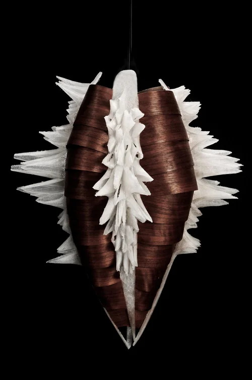 L’hérisson lamp begins an investigation into the element of texturing through the use of digital tools. The piece, being primarily 3D printed, starts an ongoing interest in the effect certain surface treatments have on the viewer, evoking different emotions. When observing this lamp one often finds themselves either provoked by disgust or fascination. It is the power of influencing the senses through optical tactility that enables a provoking response to an object, such as a lamp.