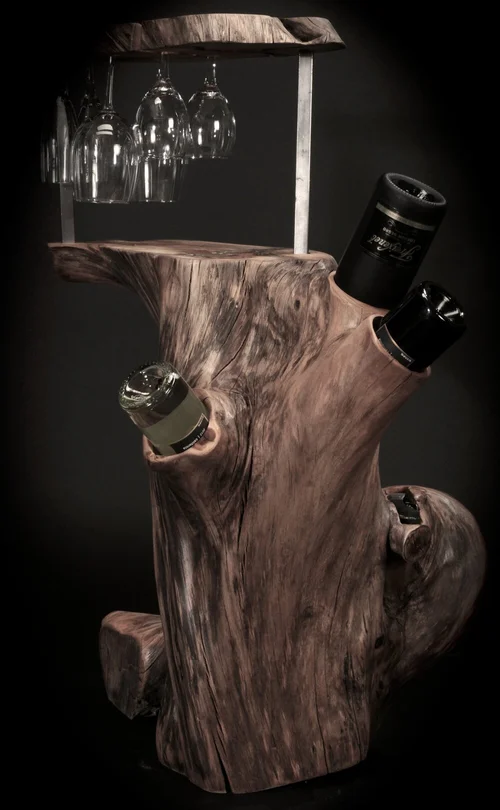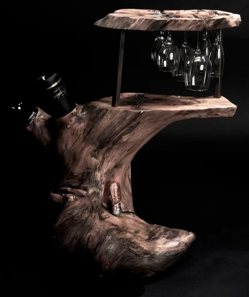 This piece made perfectly for two, holds place for two white wine glasses, two red wine glasses, and two champagne glasses. These are accompanied by three personalized bottle holders; for white wine, red wine and champagne. Soft light glows from the core while small carved indents in the wood cradles wine accessories. With its rugged and refined touch this piece accompanies every glass perfectly, as does the wine completes the piece itself.